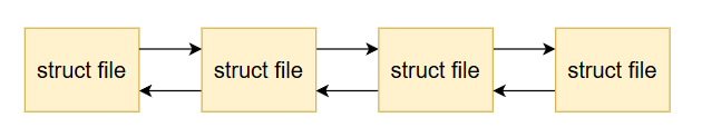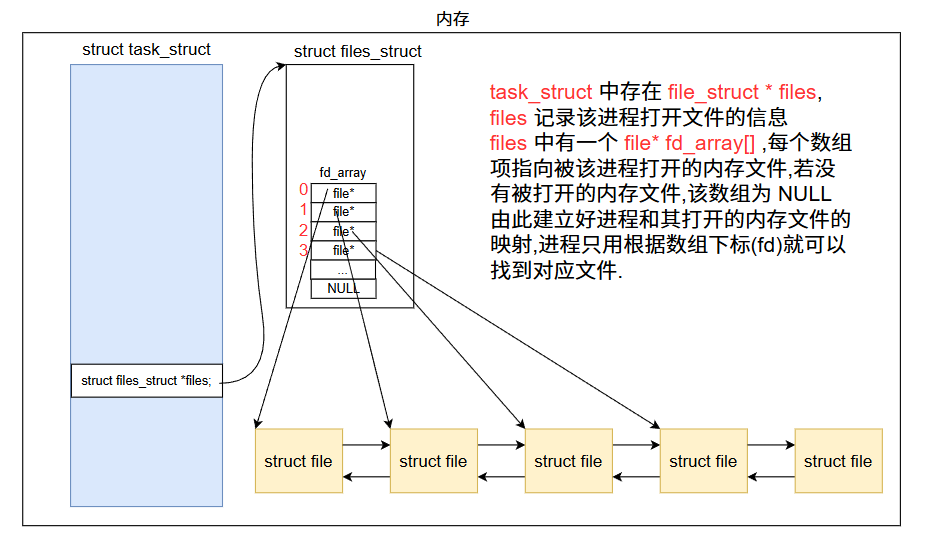 由于系统中可能同时存在大量被不同进程打开的内存文件,为了高效管理这些内存文件,Linux 设计了专门的 文件结构体 (如 struct file),每个内存文件都对应一个这样的结构体实例.系统会将所有文件结构体用链表的形式串联起来,如此一来,对内存文件的管理,本质上就是对这个链表的增删查改操作.