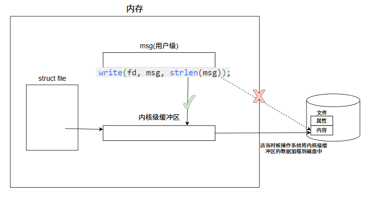 write并不会将数据直接写入磁盘,而是将用户态 msg的内容复制到内核级缓冲区.数据会暂时存放在内核缓冲区中,直到内核缓冲区满,调用 fsync或系统调度时,操作系统才会批量将内核级缓冲区的数据写入磁盘.