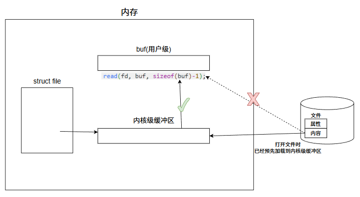 read会将内核级缓冲区(已缓存的文件数据,位于内核态内存)的内容,拷贝 到用户态的 buf.整个过程 read并不直接访问磁盘,而是读取内存中的内核级缓冲区.