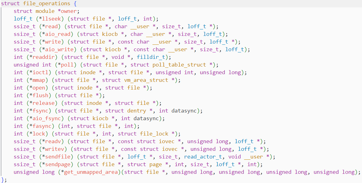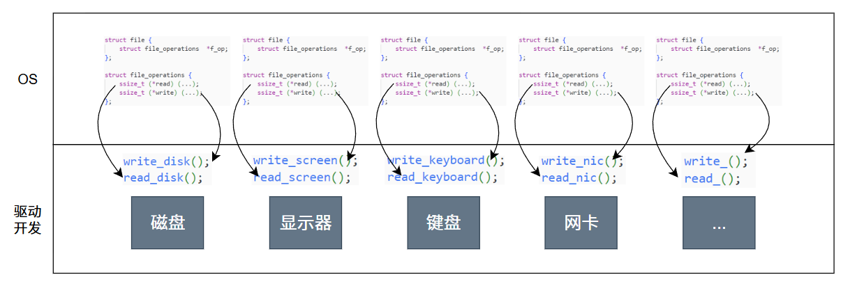 在 C 语言中,Linux 内核正是通过 struct file和 struct file_operations的组合, 模拟了面向对象中的"多态"特性 --- struct file 相当于"基类",struct file_operations 中的 read/write 等函数指针则相当于"虚函数",而不同设备的 file_operations 实例则是"派生类"对虚函数的具体实现.