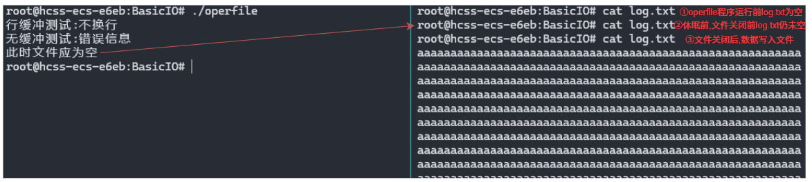 普通文件是全缓冲,用户级缓冲区为 4 KB,写入了不到 4KB 的数据,用户级缓冲区未满,文件再休眠2s前为空,随后关闭文件触发用户级缓冲区刷新,数据写入文件.