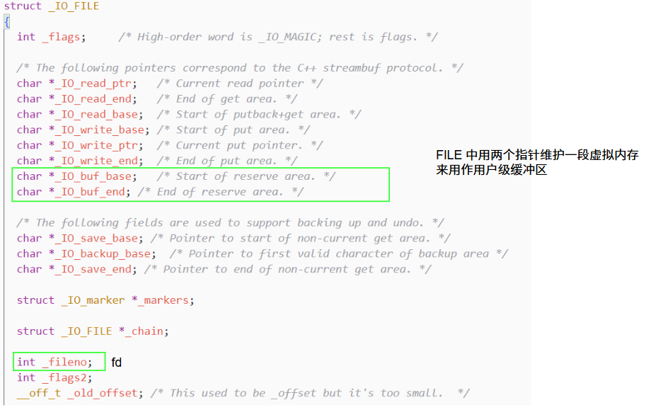为了解决这个问题, C 语言的标准库在 FILE指针中做了一层关键封装:它不仅包裹了与内核交互的 fd(文件描述符,用来关联内核级缓冲区和文件), 还额外封装了一块 语言级缓冲区(位于用户态内存的一块临时存储区域) --- 核心目的就是 "攒够数据再批量发起系统调用",从而最大化减少系统调用的次数.