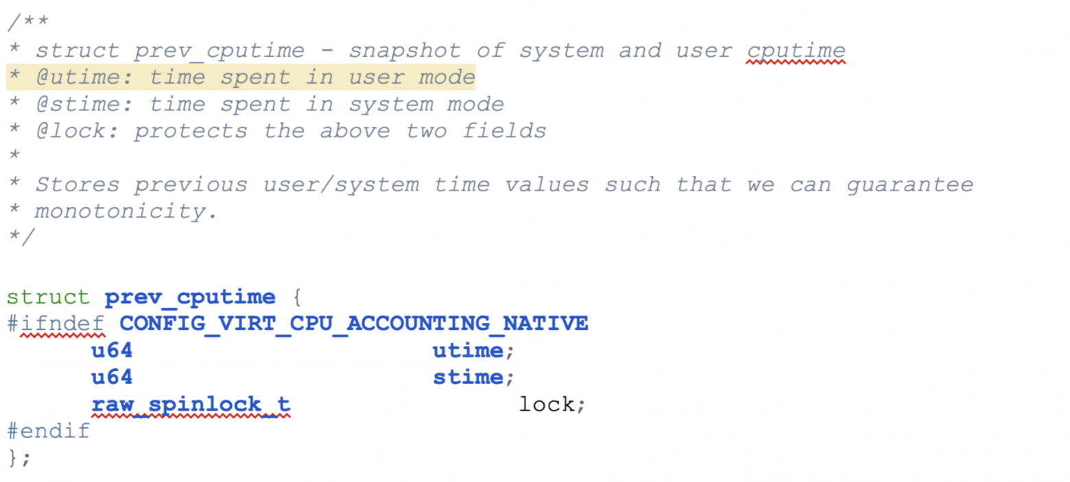 以这种方式收集的数据需要以某种方式存储和更新。内核使用多种方式来实现这一点。例如,如果讨论的是正在运行的进程,那么每个进程的信息都存储在一个task_struct名为进程控制块(Process Control Block, PCB)的数据结构中------PCB 是操作系统用来管理和存储进程所有信息的进程对象。PCB 包含许多时间计数器,例如,用于显示进程在执行期间用户模式或系统模式下消耗的 CPU 时间。