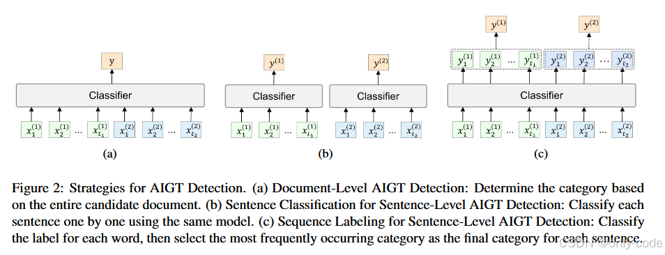 AI-generated text(AIGT) 就是由大语言模型(LLM)生成或重写的文本。现在常见的检测任务通常是这样的输入输出:给你一篇文章,让你判断它是不是模型写的,或者是不是某个特定模型写的。之前的工作大多停留在"整篇文档"的层面。