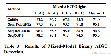 在"多个模型混在一起,只区分 AI vs Human"的设定下,作者比较了 Sniffer、Sent-RoBERTa、Seq-RoBERTa 和 SeqXGPT。