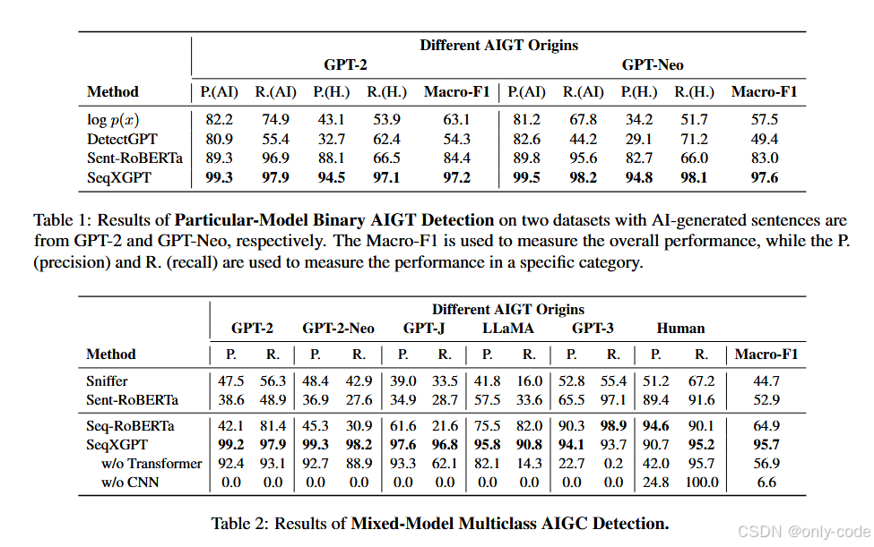 - SeqXGPT 的 Macro-F1 稳定在 97% 左右,两类的 Precision / Recall 都接近 95%~99%。