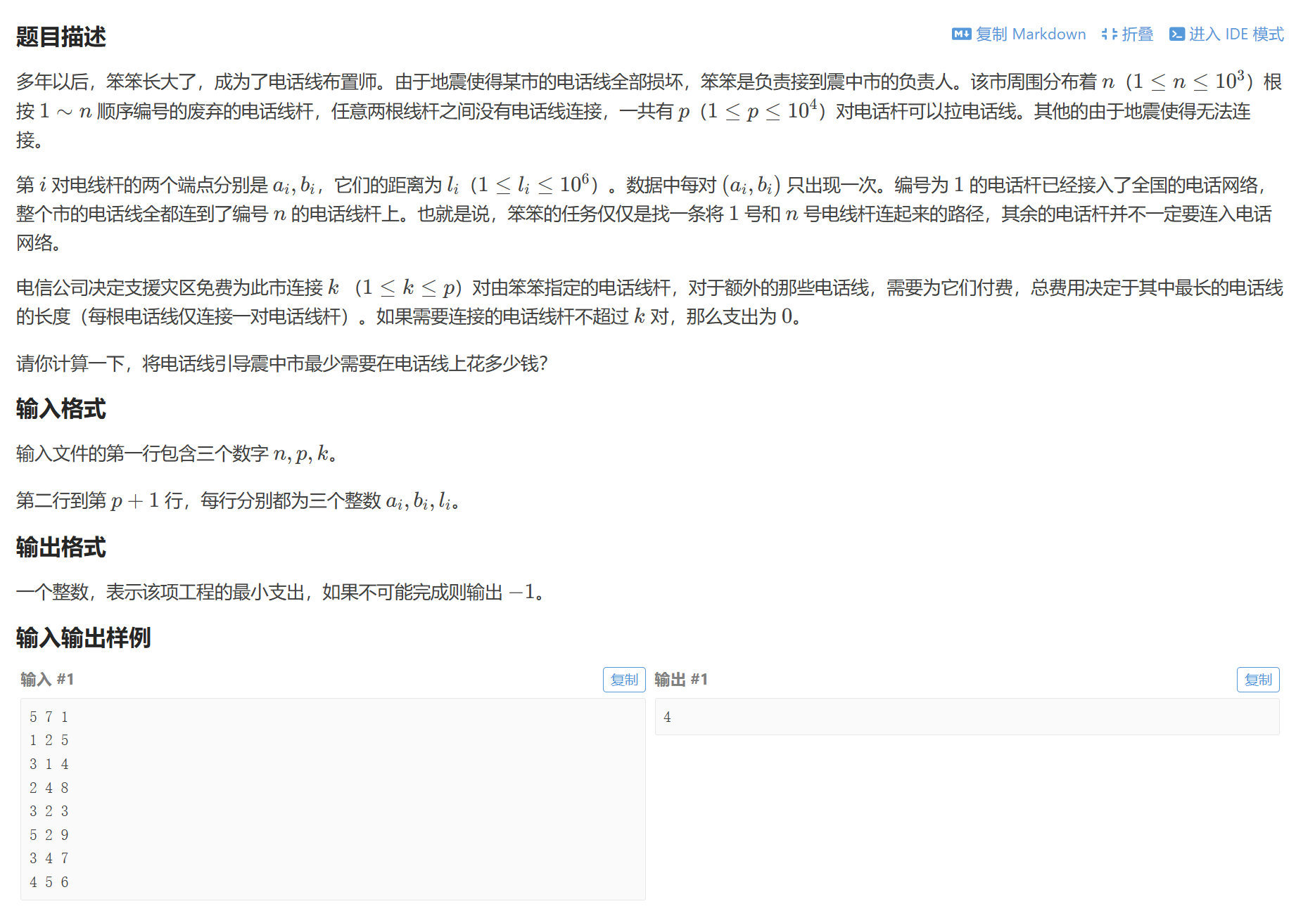 //总费用决定于其中最长的电话线的长度 二分需要花钱的最大值