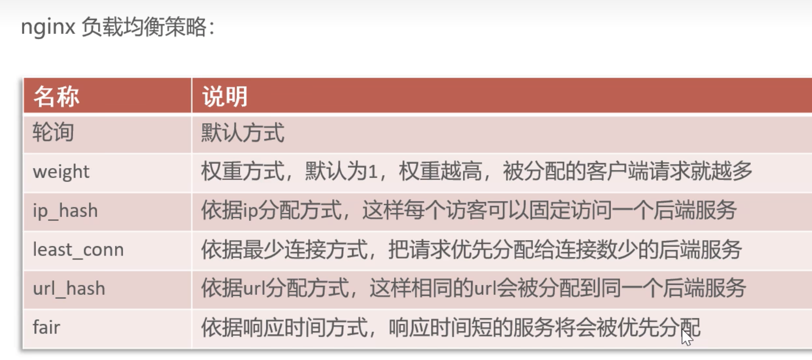 | 轮询 | 默认/无 | 按顺序轮流分配 | 简单系统,后端性能差不多 |