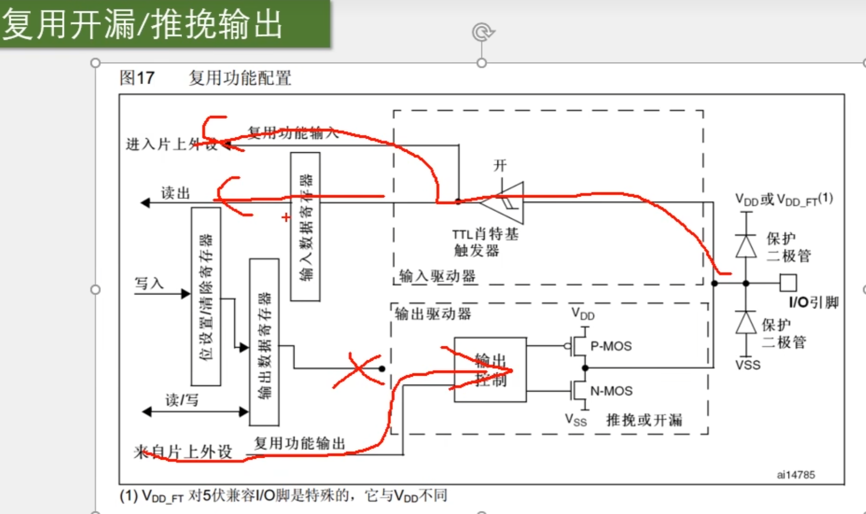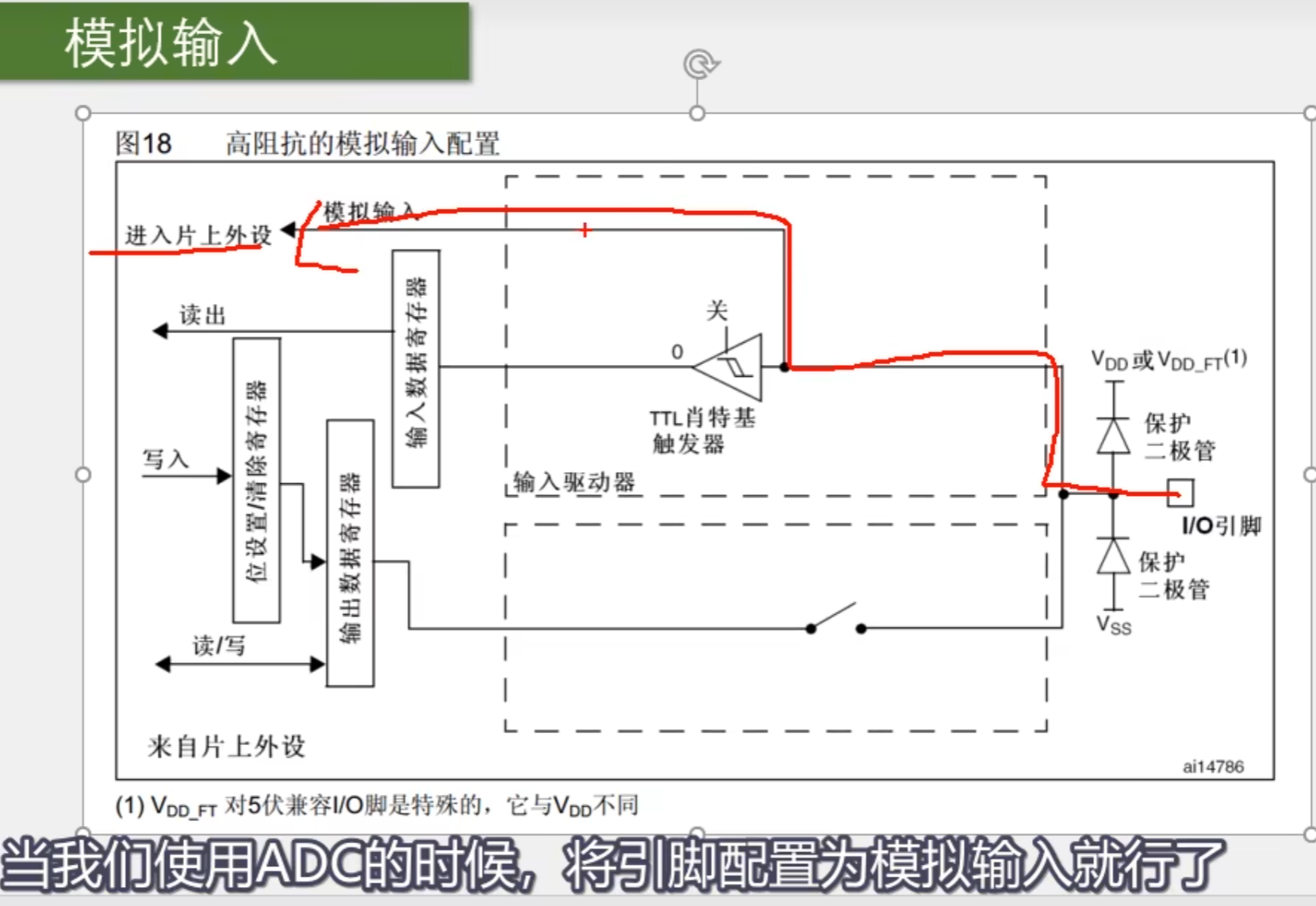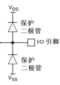 Vdd即为3.3V,而Vss即为0V,当我们的输入电压从引脚输入进去,当输入电压大于3.3V,则此时上面的二极管就能够导通,电压传到上面去了,就会保护我们的内部电路,当输入电压小于0V,则此时我们的下面二极管就会导通,则电压就会从引脚导出去,也不会进去我们的内部电路