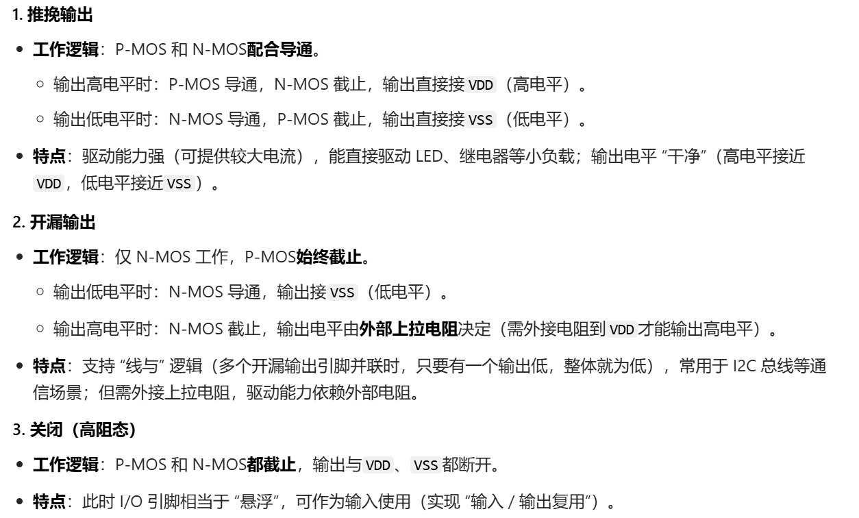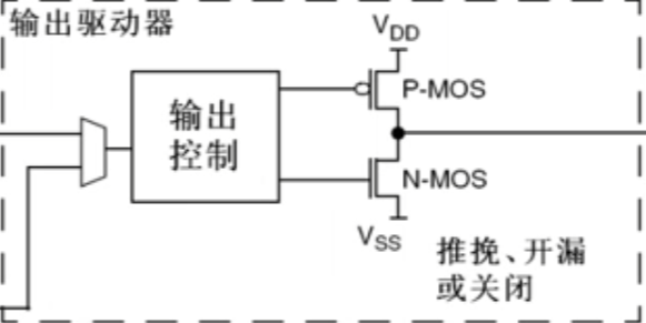 其实很简单,此时输出驱动器是关闭的,然后只看输入驱动器,只需要根据程序去进行匹配是上拉还是下拉还是浮空