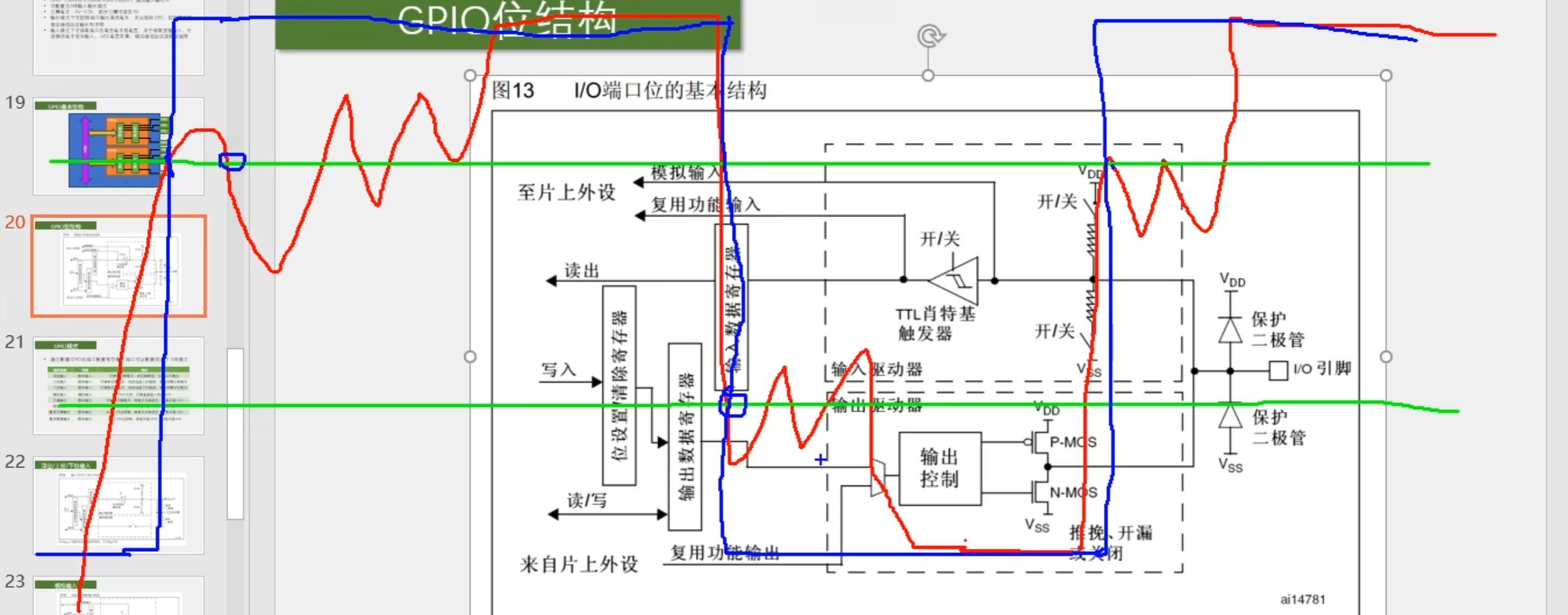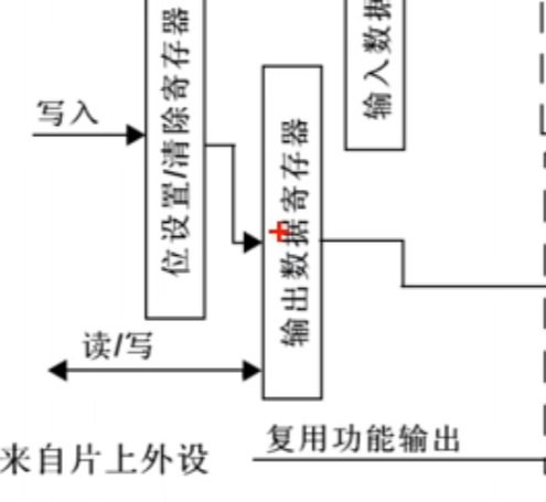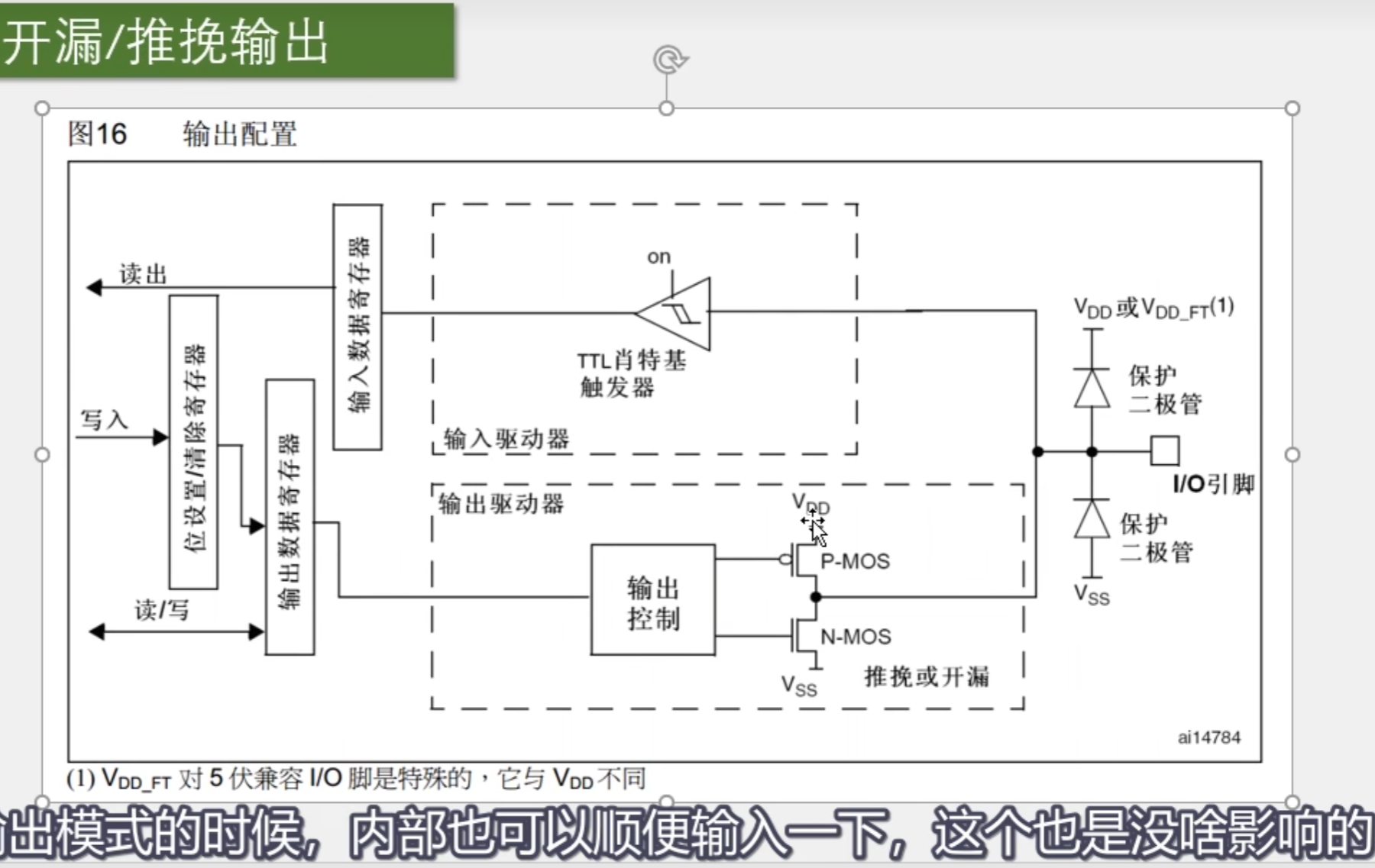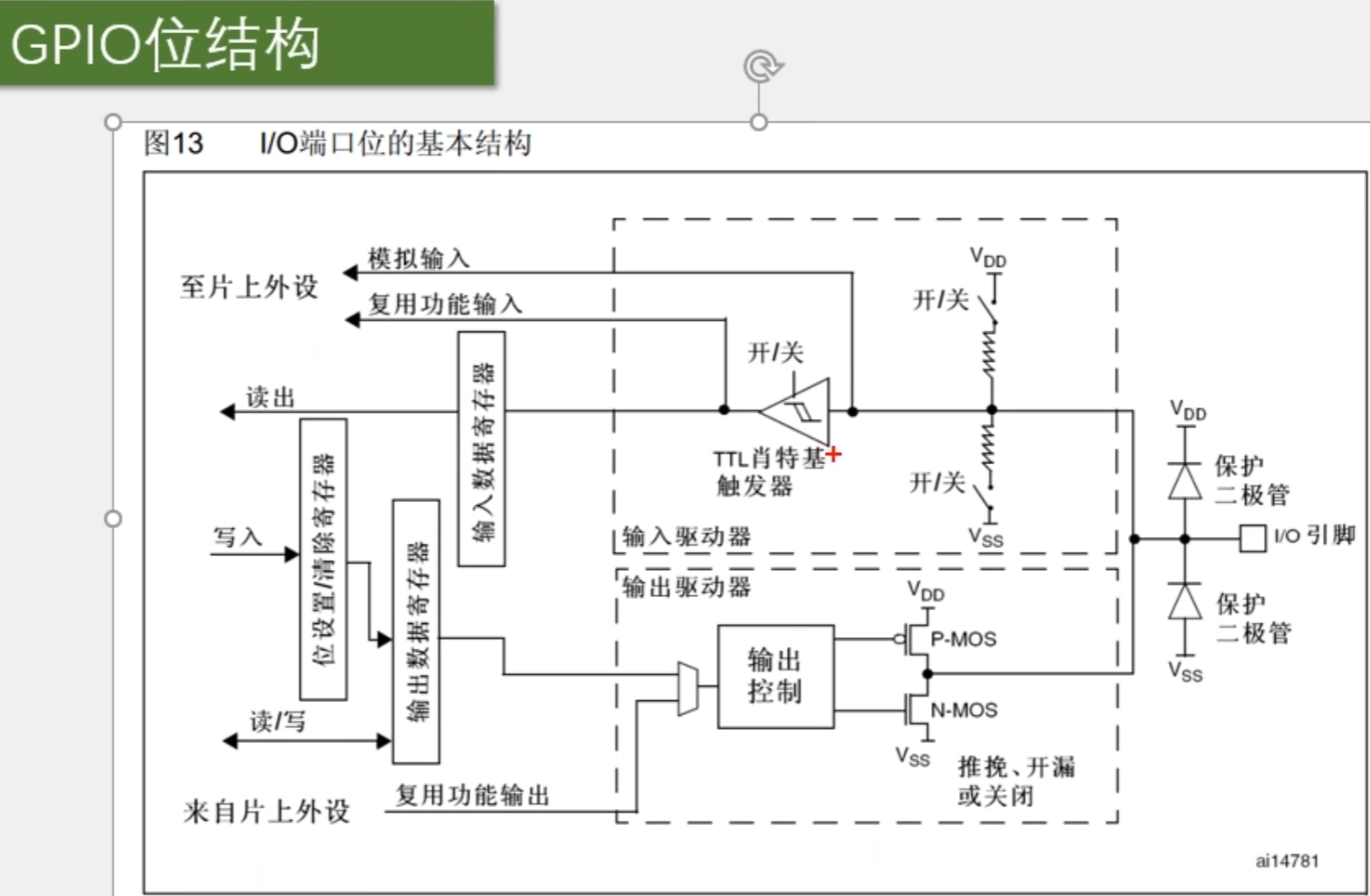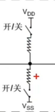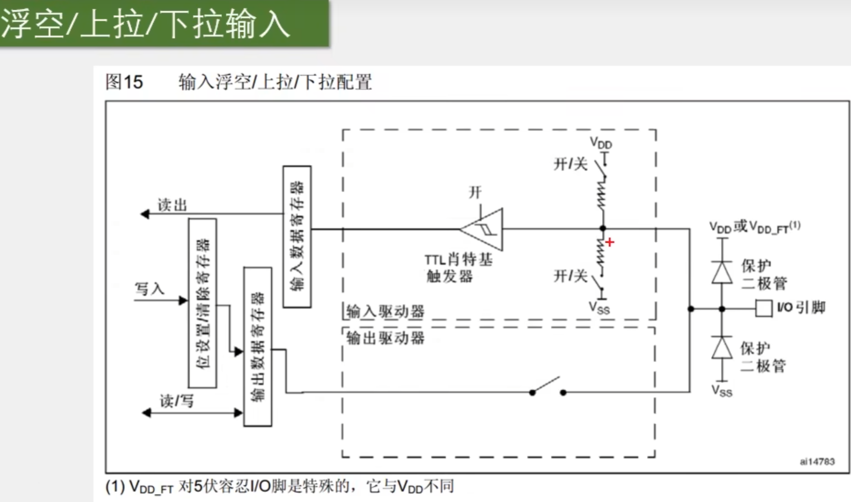 这就是我们的上拉电阻和下拉电阻,这是可以通过我们的程序去进行配置的,这个设计,是为了让我们的I/O输入具有确定性,我们可以通过程序配置,让这个模块处于上拉状态或者下拉或者浮空状态(即哪个也不闭合)