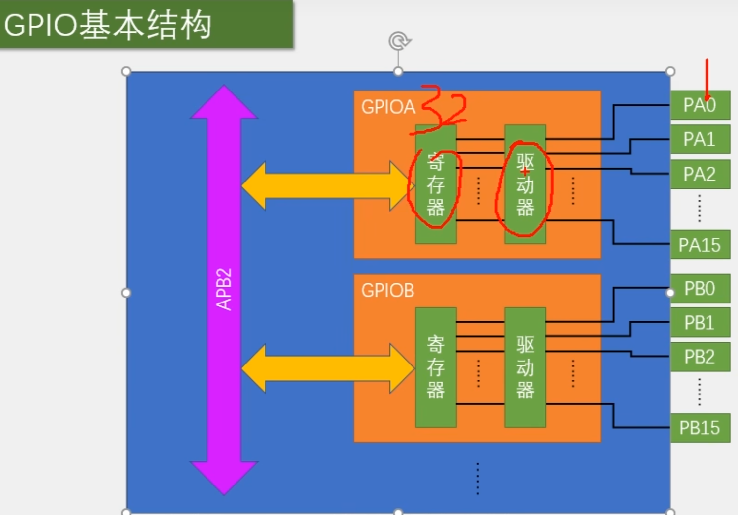 我们通过寄存器来达到读取二进制位置,存储配置、传输数据、控制状态,而驱动器则是控制指令让我们的比如说灯亮,蜂鸣器响之类的操作,还要记住一个特点是,由于我们的STM32是32位的,而我们的引脚是16位的,因此寄存器的高16位闲置,而低16位的位置对应引脚