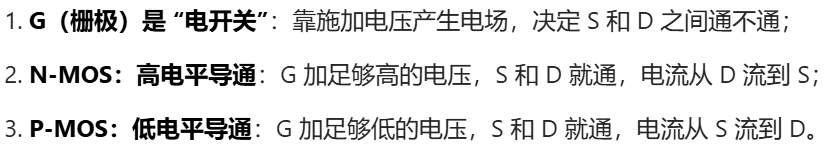 当我们输出为1,此时即为高电平导通,此时电流从D流到S,即PMOS管导通,此时电流从Vdd流出引脚,,若输出为0,此时即为低电平导通,此时电流从S流向D,即电流从Vss流出引脚,当然这是在PMOS和NMOS都是开启状态下的时候,即推挽状态下