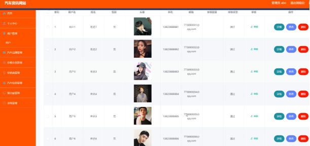 汽车资讯网站的系统管理员可以管理用户,可以对用户信息修改删除审核以及查询操作。具体界面的展示如图所示。