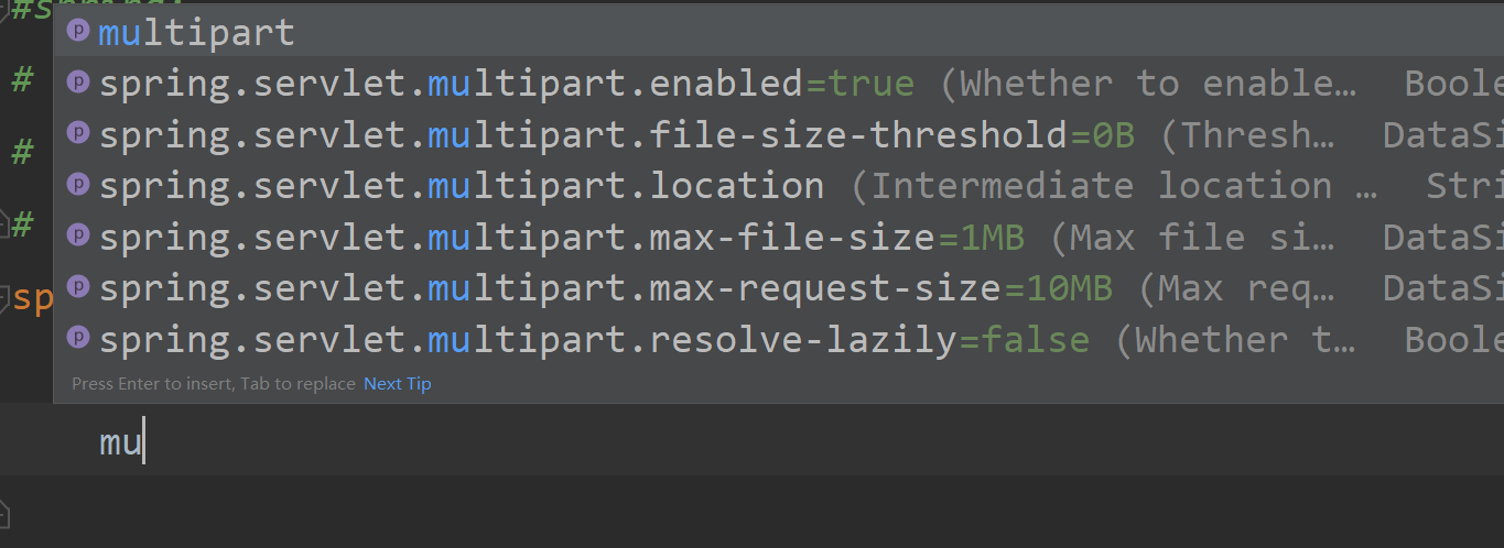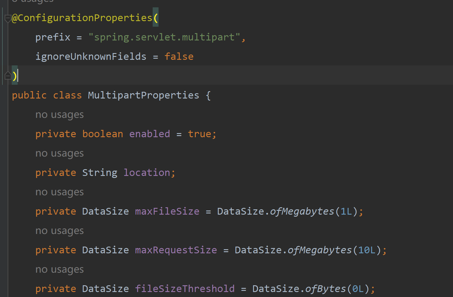 其中文件上传的各种配置定义在multipartProperties中,使用@EnableConfigurationProperties中间application.properties中的各项配置加载到类当中。