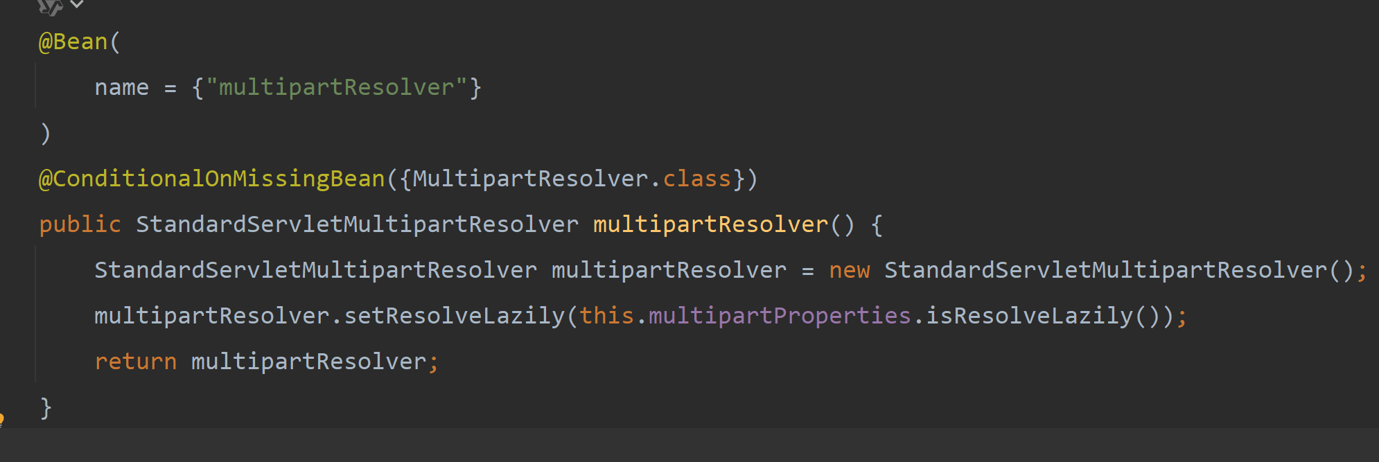 当我们做文件上传的时候我们也会发现multipartResolver 是自动被配置好的,它被封装在MultipartAutoConfiguration 类中,处于org.springframework.boot.autoconfigure.web.servlet 包下。