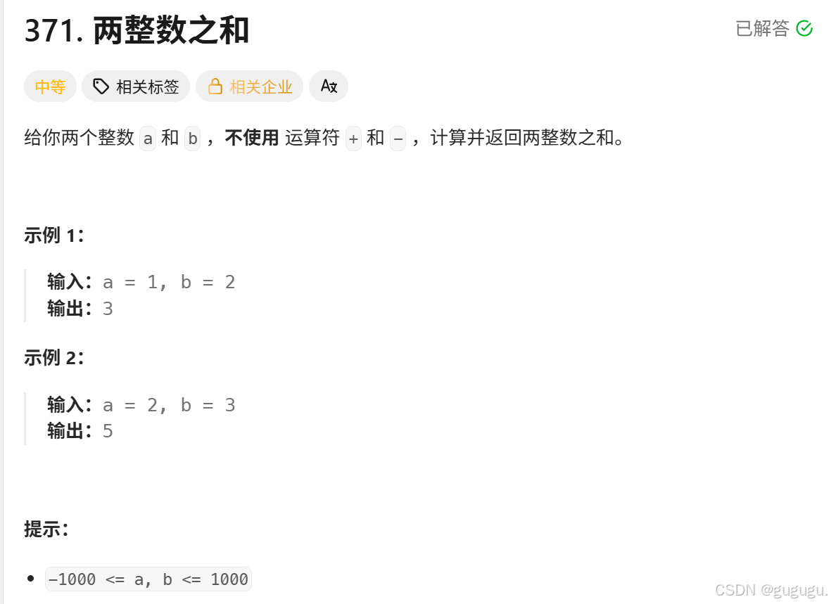 int carry = (a & b) << 1;//获取进位信息,并保存