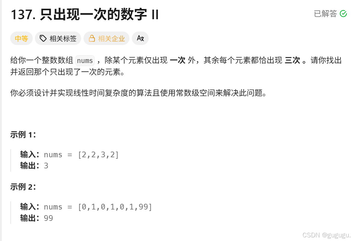 所以,现在,思路已经很明确了,就是把每一位上1出现的次数全部加起来,看看是不是三的倍数,如果不是三的倍数,就把该位设置为1,