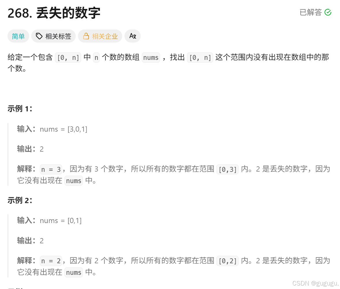 我们把0~n的所有数字和数组里面的所有数字,全部按位异或一遍,最后得到的结果就是丢失的数字。