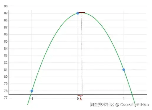 我们知道 f(−1) = a, f(0) = b, f(1) = c。对于我们这个例子,a = 78, b = 89, c = 81。因此可以算出 λ ≈ 0.078。正如我所说,它接近零。但在精确的圆形边缘过渡处,你可能会看到其他情况(峰值不在像素正中心),如下图所示。
