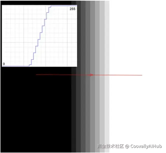 这条分界线就是图像中灰度值发生突变的地方,从暗到亮,或从亮到暗。如果你沿着一条水平线绘制穿过这条边界的亮度值,你会看到一个突然的跳跃:一段平坦的黑像素区域,一个急剧上升的过渡区,然后又是一段平坦的白像素区域。
