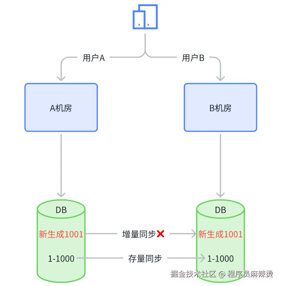 | 缺点 | 1. 同步方式:该方案只支持单向同步 2. 风险:需要确保A中的表自增主键不会迅速增长到B的值、确保A表中不会设置较大主键 3.全面性:除非A机房后续废弃不用,否则增量同步的数据终会出问题 | 1. 开发量:需要对表的创建操作设置主键值 2. 主键类型是不是bigint,防止越界 3. 通过接口提供的主键值,过长是否会有问题。如js对int64会丢失精度 |