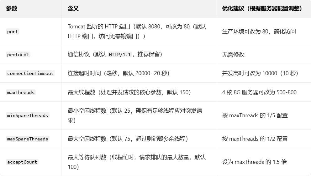 Tomcat 配置集中在 conf 目录,以下是最常用的配置文件、配置区域、参数含义,以及优化建议。
