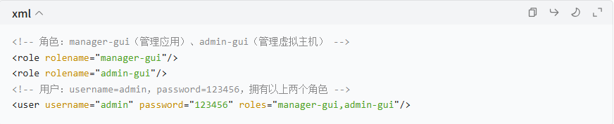作用:配置 Tomcat 管理后台(http://IP:8080/manager/html)的登录账号和权限(部署 / 管理应用用)。