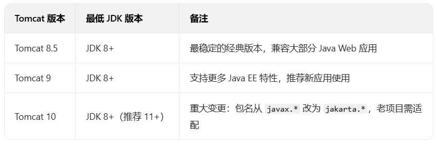 Tomcat 是 Java 开发的服务器,必须依赖 JDK/JRE 运行,且版本需匹配(关键!版本不匹配会导致启动失败)。