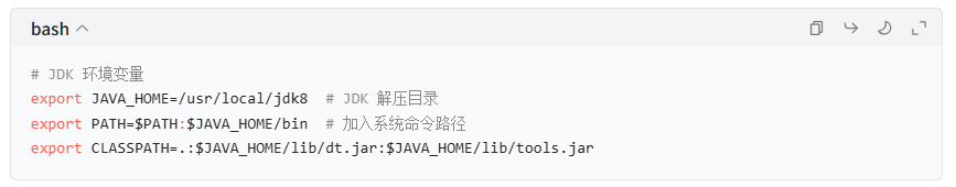 解压到指定目录:tar -zxvf jdk-8uXXX-linux-x64.tar.gz -C /usr/local/重命名(方便后续操作):mv /usr/local/jdk1.8.0_XXX /usr/local/jdk8