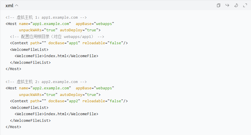 需求:用 app1.example.com 访问 webapps/app1 应用,app2.example.com 访问 webapps/app2 应用。新增 <Host> 节点(放在 <Engine> 标签内,与默认 localhost 主机同级):