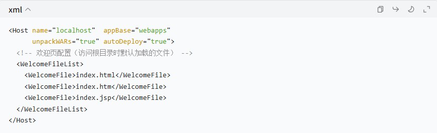 默认虚拟主机配置如下,可新增虚拟主机实现 "一台 Tomcat 运行多个网站":