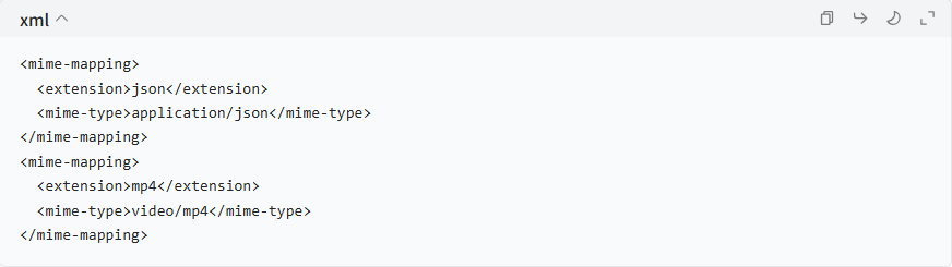 若访问 .json、.mp4 等文件时出现 "下载" 而非 "预览 / 播放",需添加 MIME 类型映射: