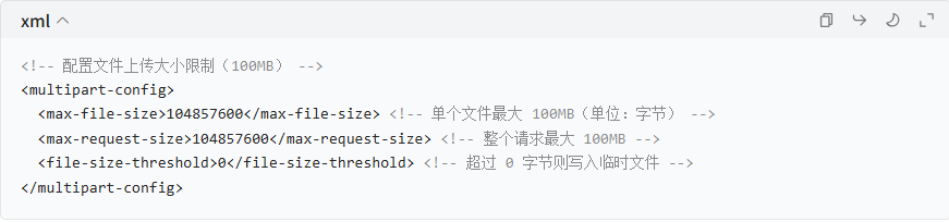 默认 Tomcat 限制上传文件大小为 2MB,需手动添加配置: