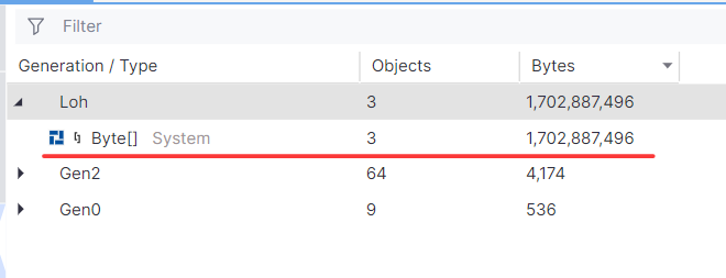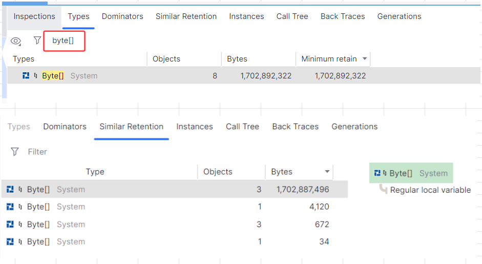 对比之后终于知道,疑似有 4 个超大的 byte[] 吃掉了 1.49G 的内存。