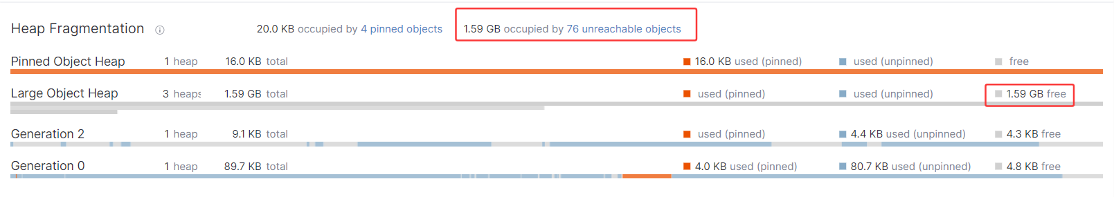 既然整条的 segment 都是 free,为什么gc不在上一阶段完整的回收它呢?带着忐忑不安的心情发现是上图中有一串数字 1.59GB occupied by 76 unreachable objects,啊,,, 原来是待回收的垃圾对象呀,但这个对象目前还不是 free 对象呀,为什么要把它当作 free 处理呢? 这种处理方式和传统的 windbg 处理模式完全不一样,需要适应一样,哈哈。