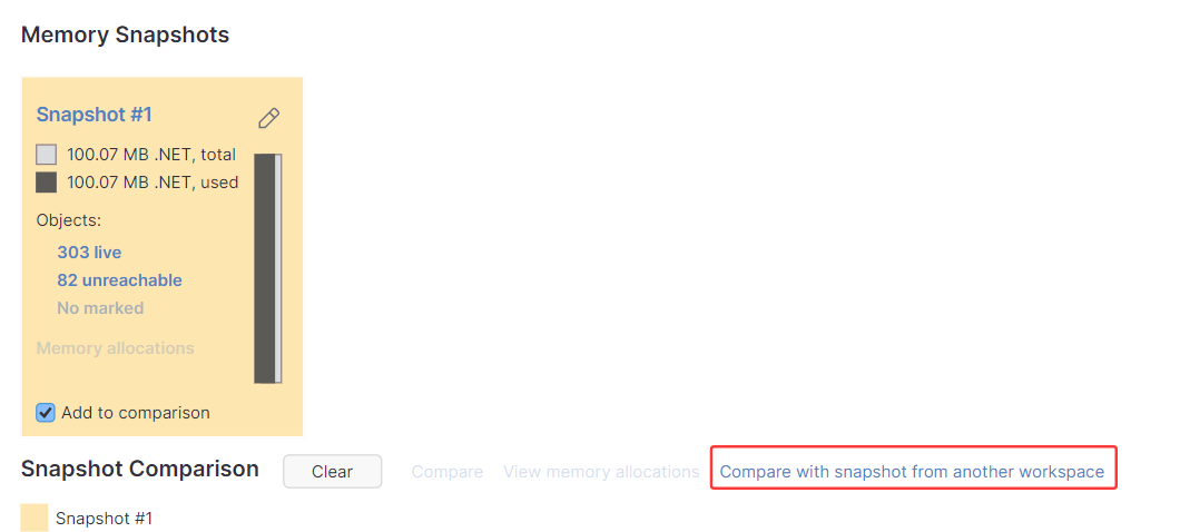 这两个dump都有了,如何比较增量呢? 做法比较简单,先将两个 dump 分别导入到 workspace 中,然后随意在一个 overview 中选择 Compare with snapshot from another workspace,即跨工作区比较,截图如下: