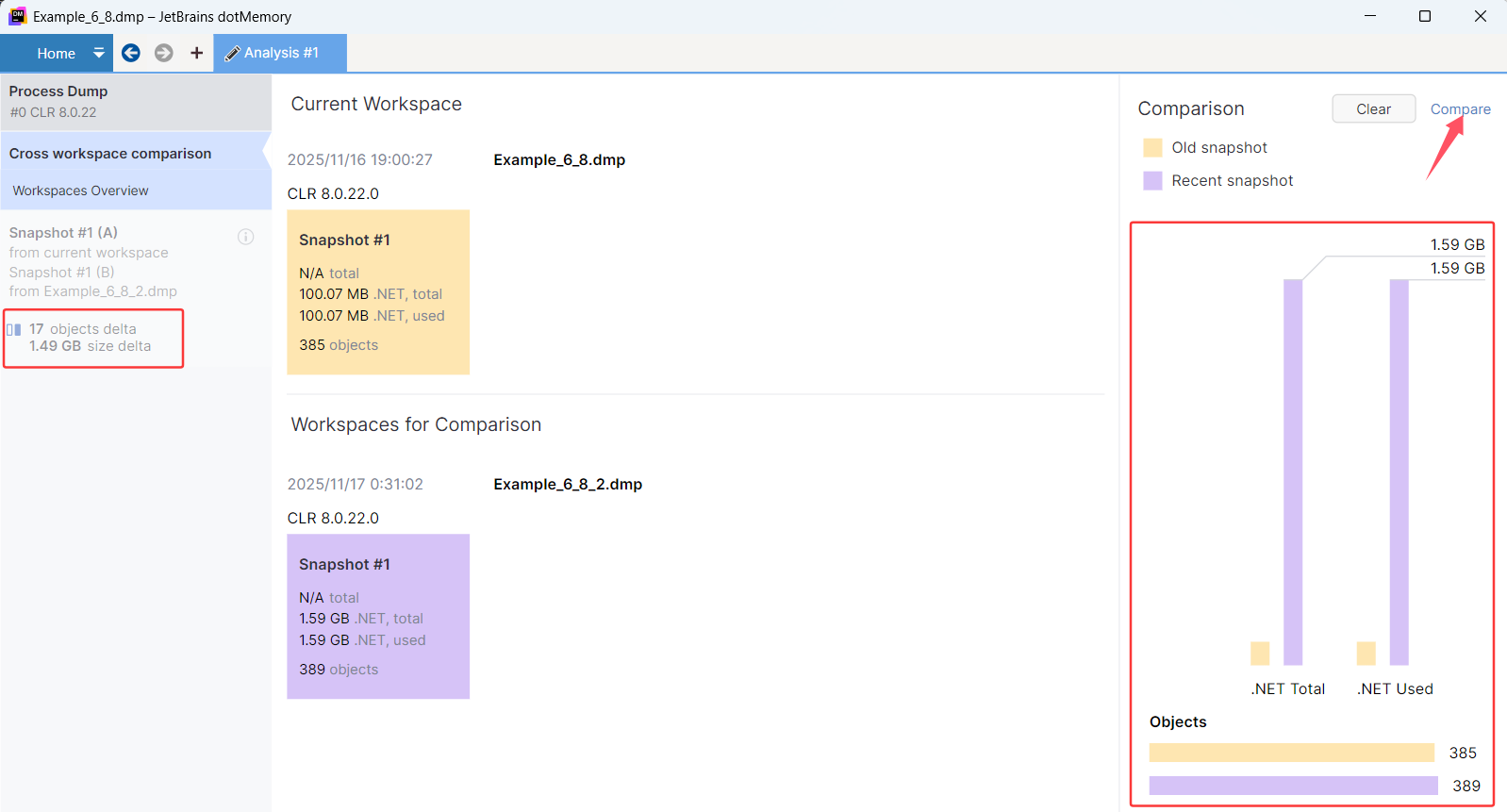 鸟瞰图并没有解决问题,所以还要点击右上角的 Compare 观察堆上的对象详情,截图如下: