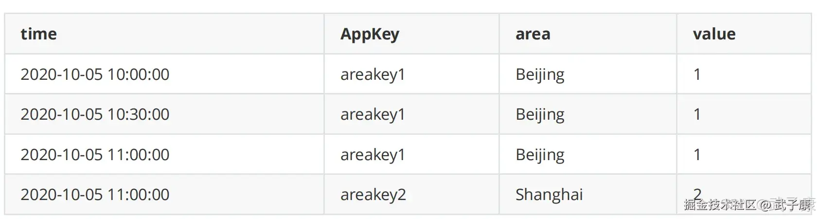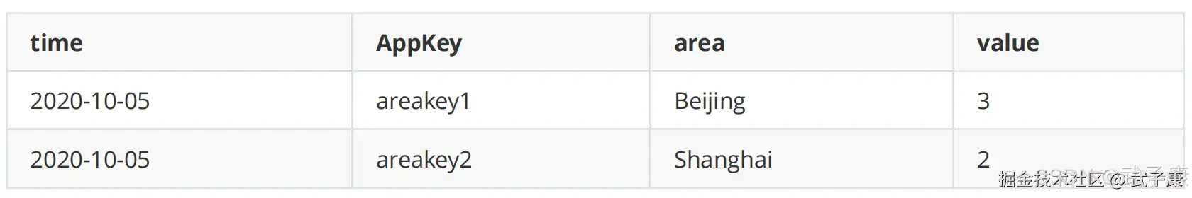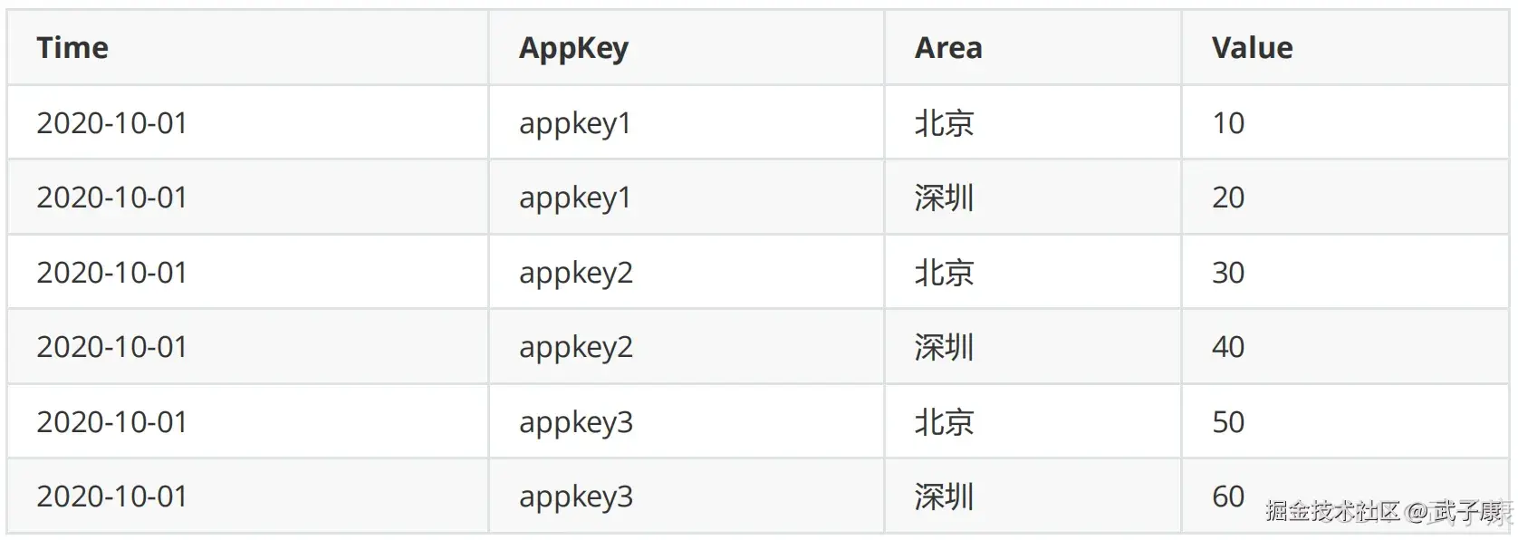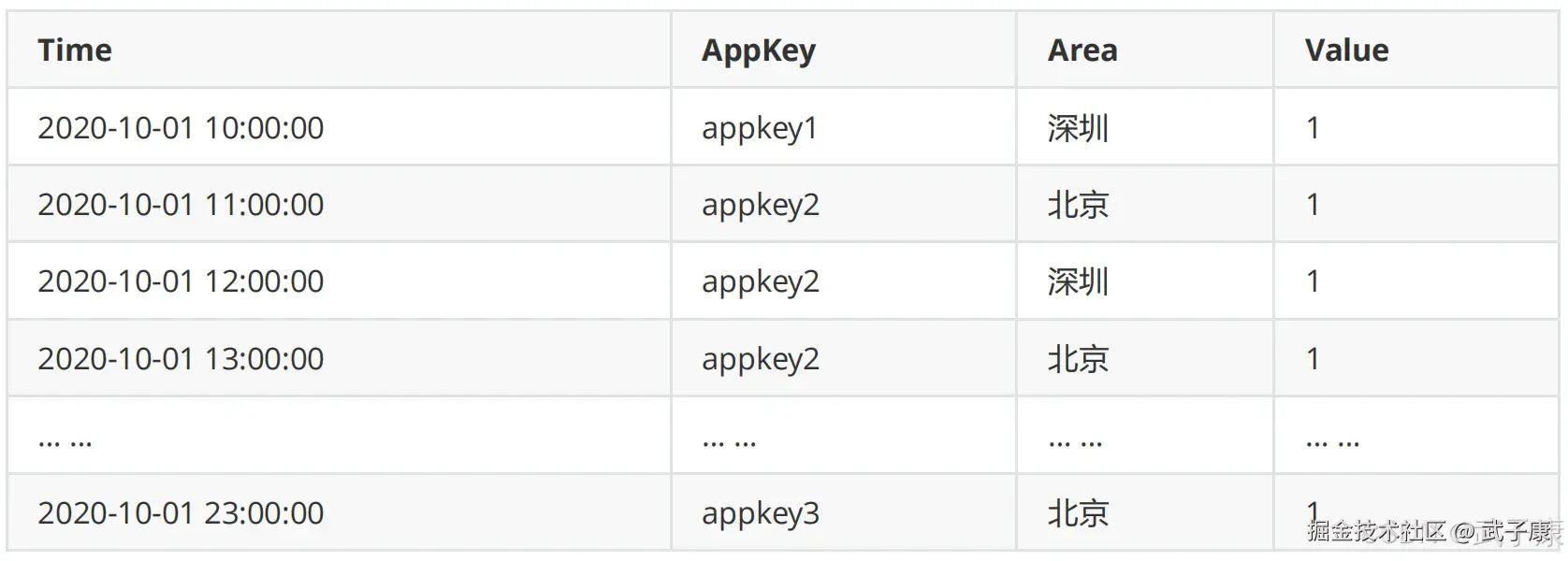 - 第一列为时间,Appkey和Area都是维度列,Value为指标列