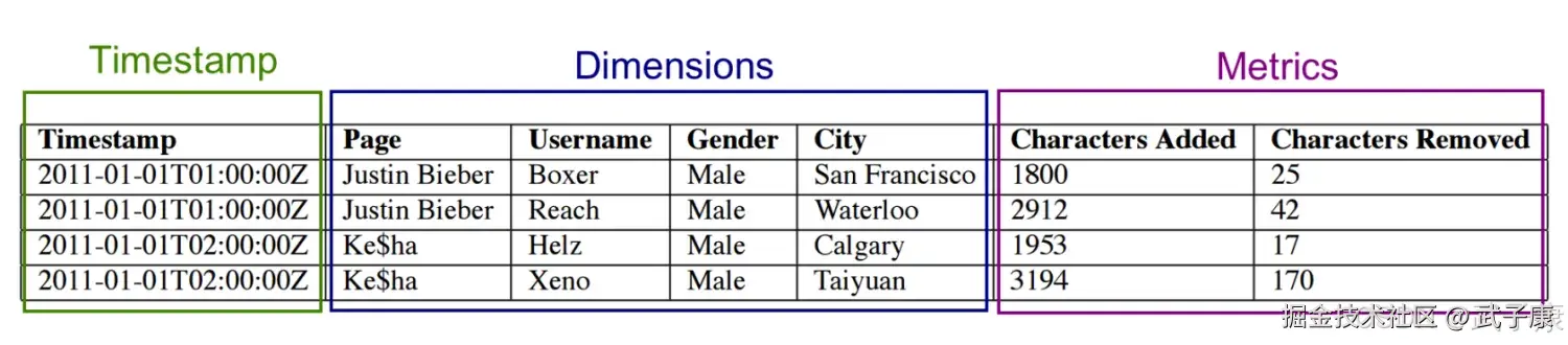 - 类型2 维度列:用来过滤Fliter或者组合GroupBY的列,通过是String、Float、Double、Int类型