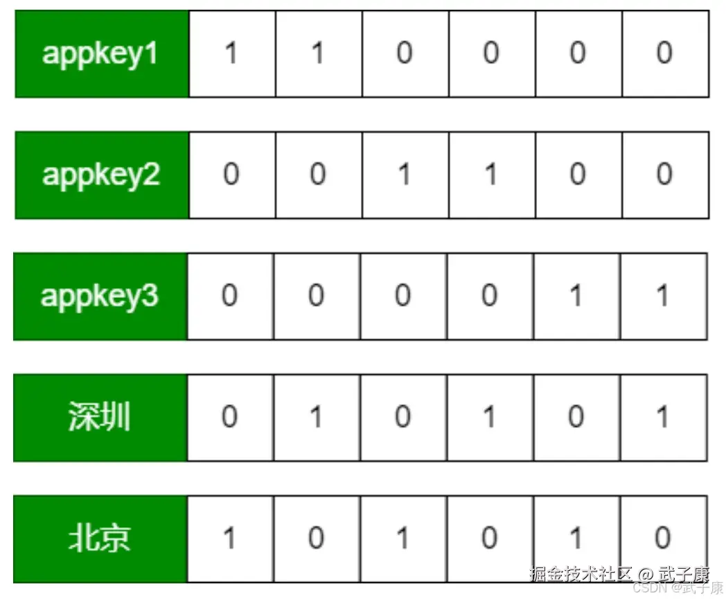 - appkey in ('appkey1', 'appkey2') and area='北京' 查到各自的bitmap
