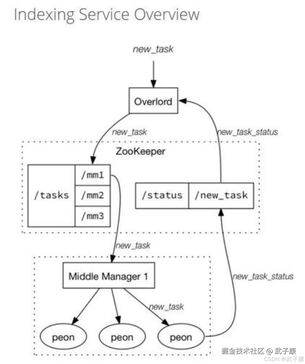负责创建Task、分发Task到MiddleManger上运行,为Task创建锁以及跟踪Task运行状态并反馈给用户