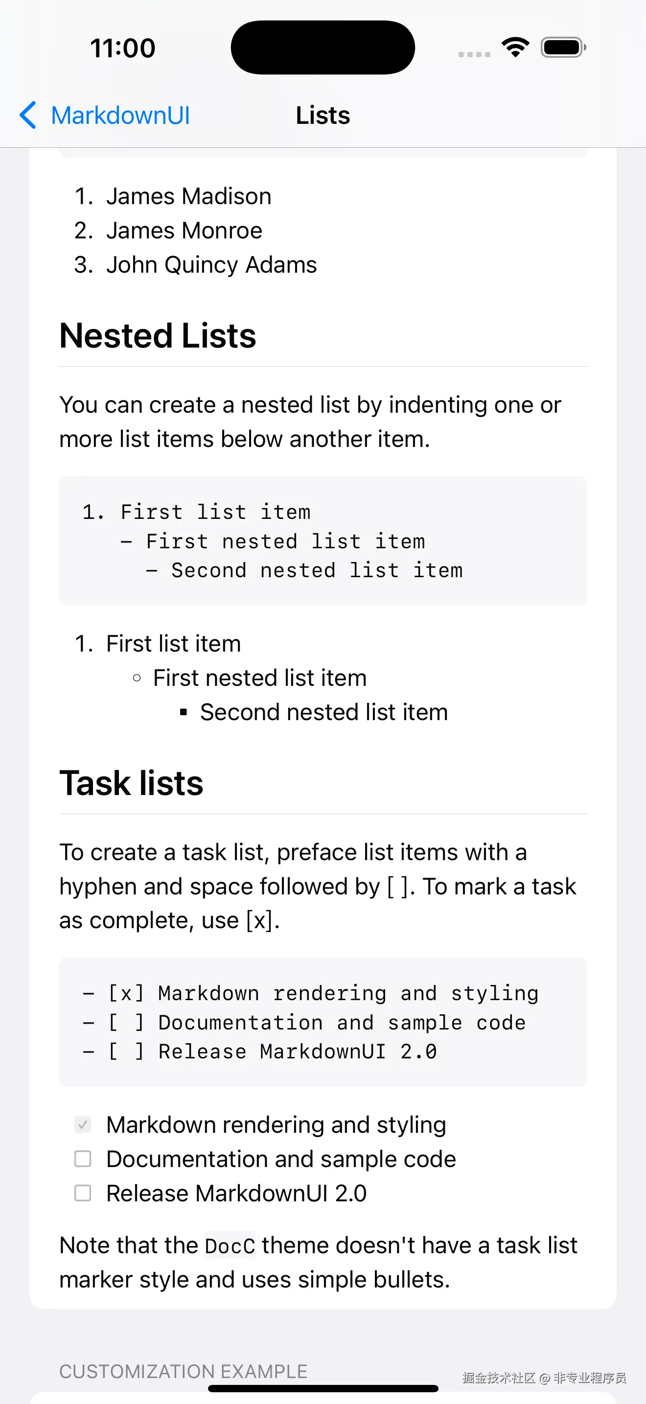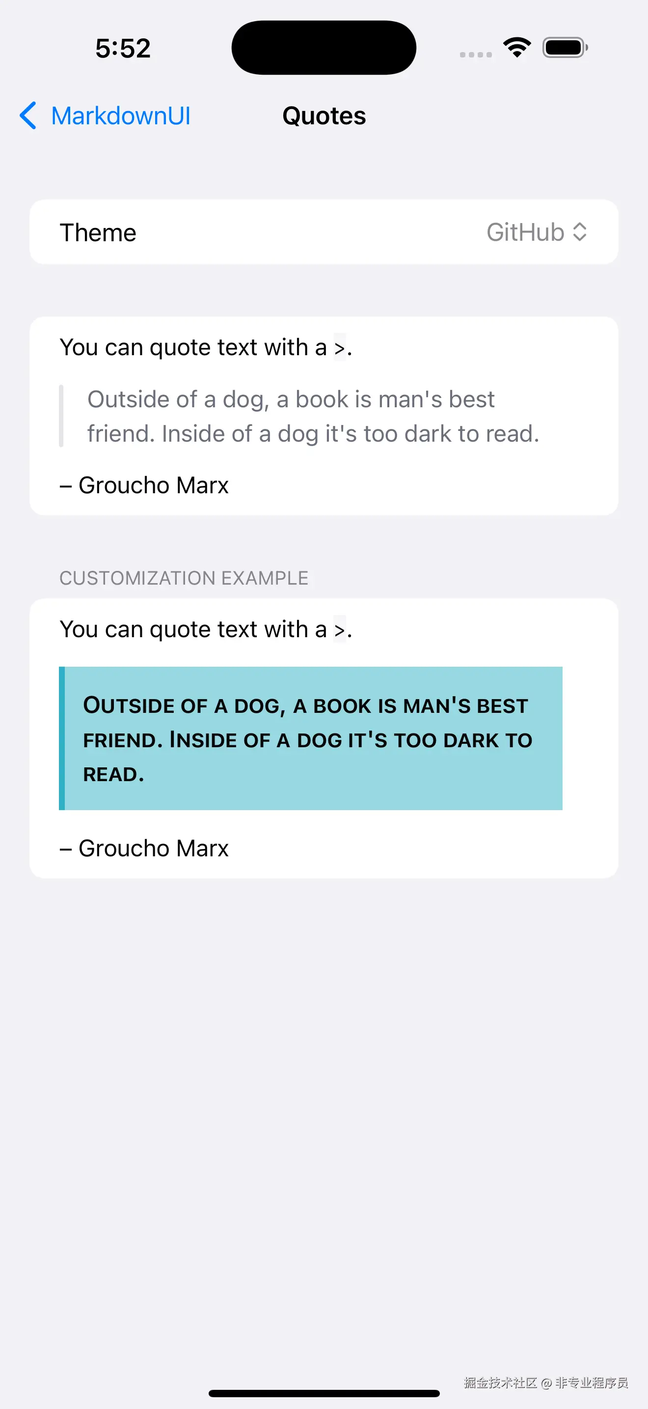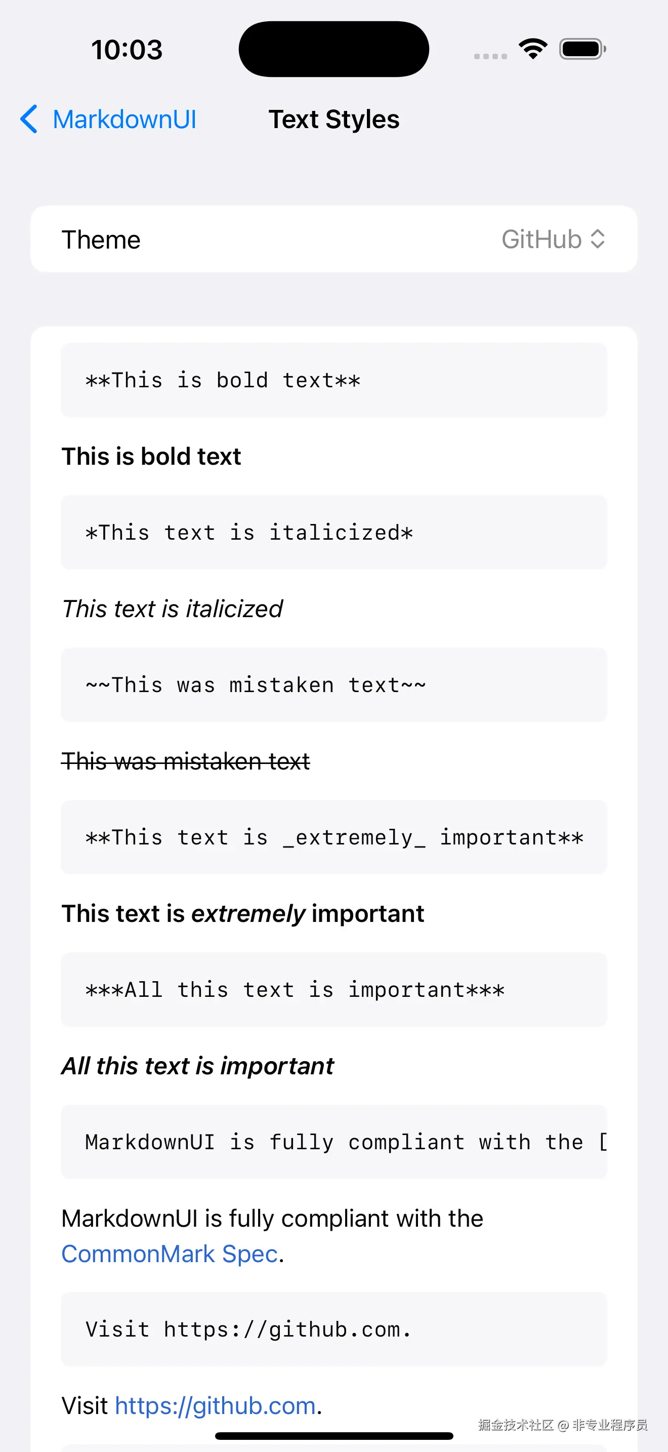 swift-markdown-ui 提供了 basic、github、docC 三种内置主题,在这三个主题的基础上,支持开发者覆盖默认配置,也可以完全自定义一个新的主题传入。
