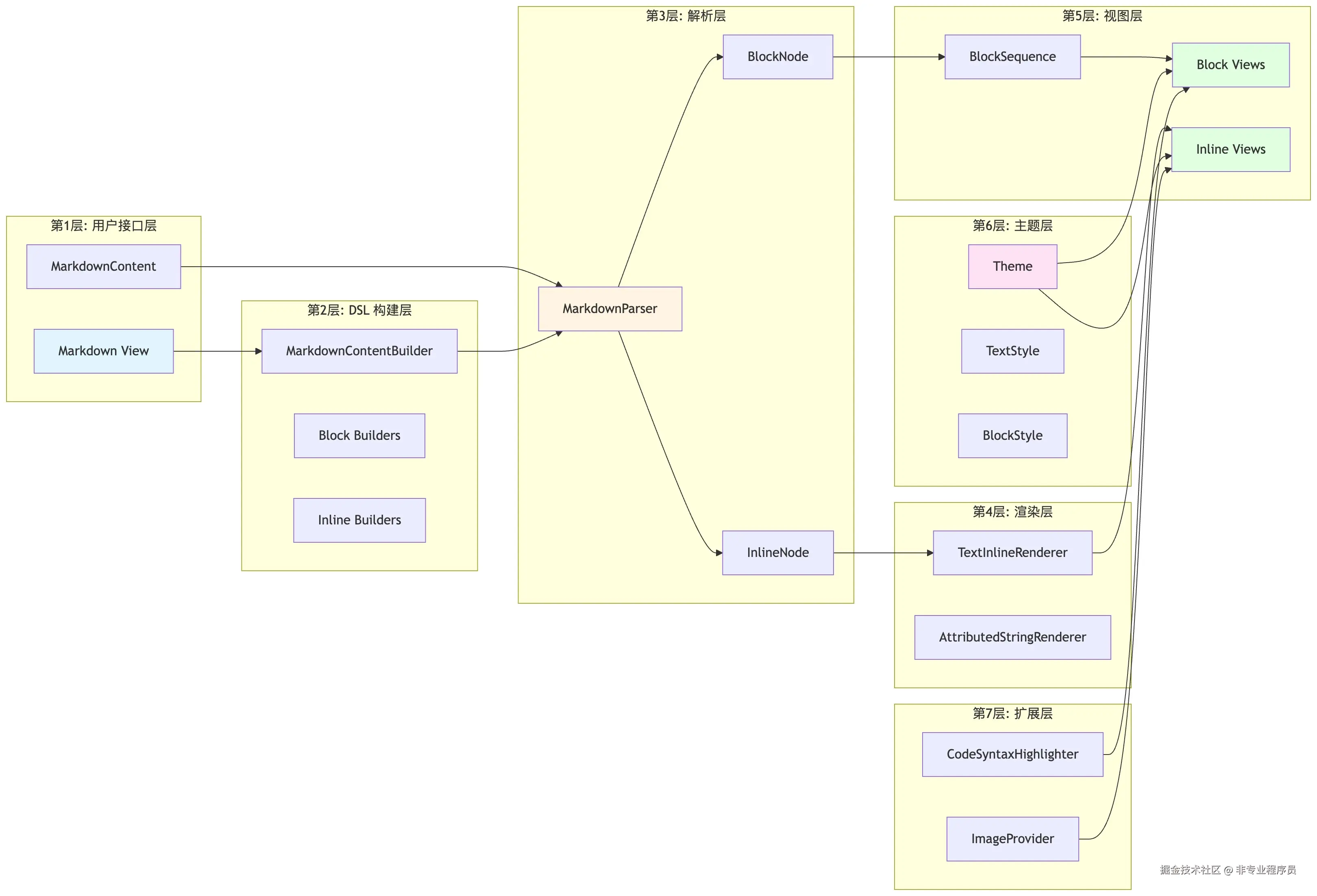- DSL:Markdown 构建器,提供 MarkdownContentBuilder,支持声明式语法构造 Markdown