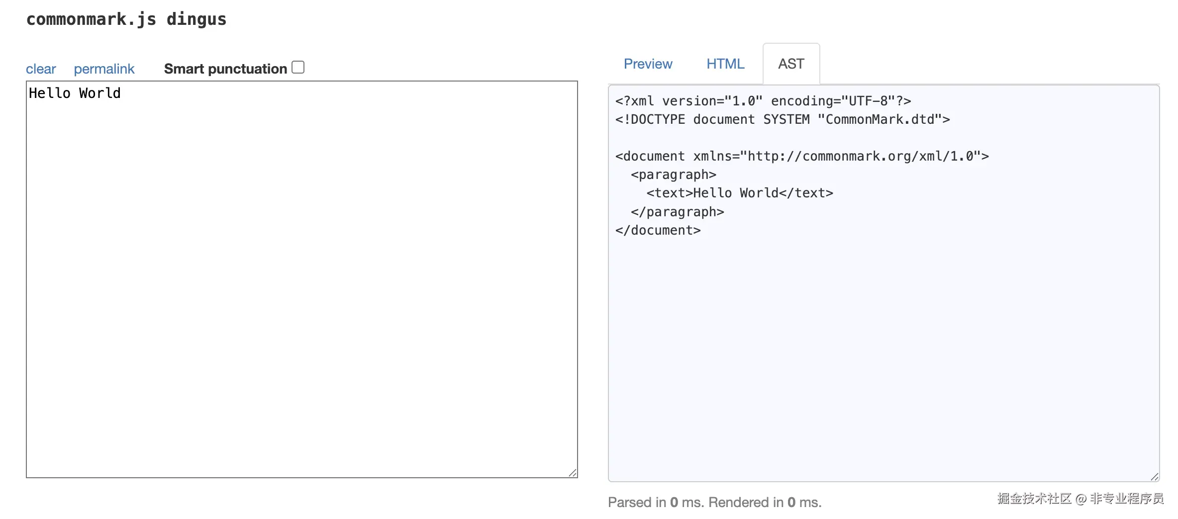 cmark-gfm 的解析原理是将 Markdown 字符串解析成语法树,外部可以通过遍历语法树来处理每一个节点,Markdown 的语法树可以通过网站 spec.commonmark.org/dingus/ 查看。