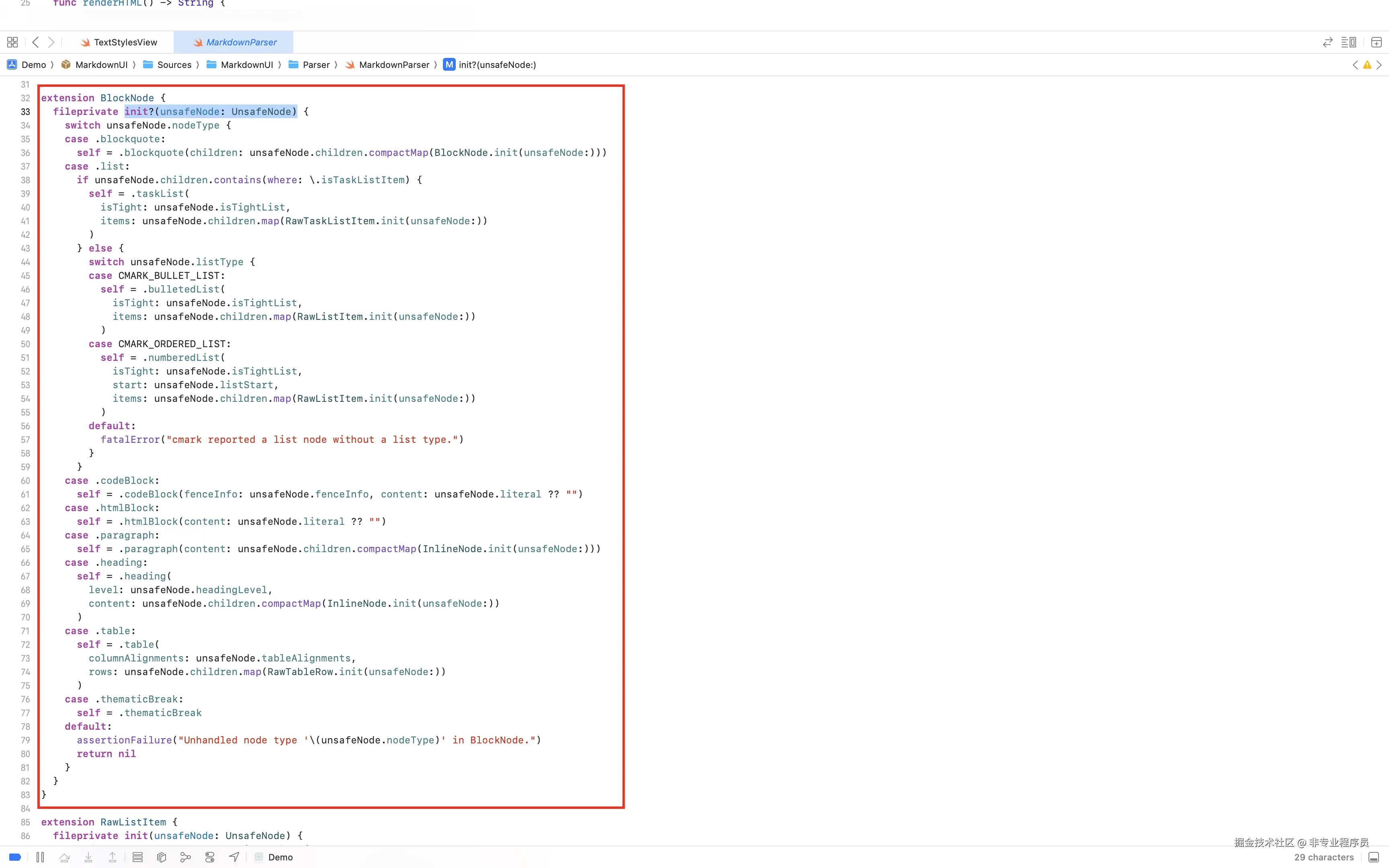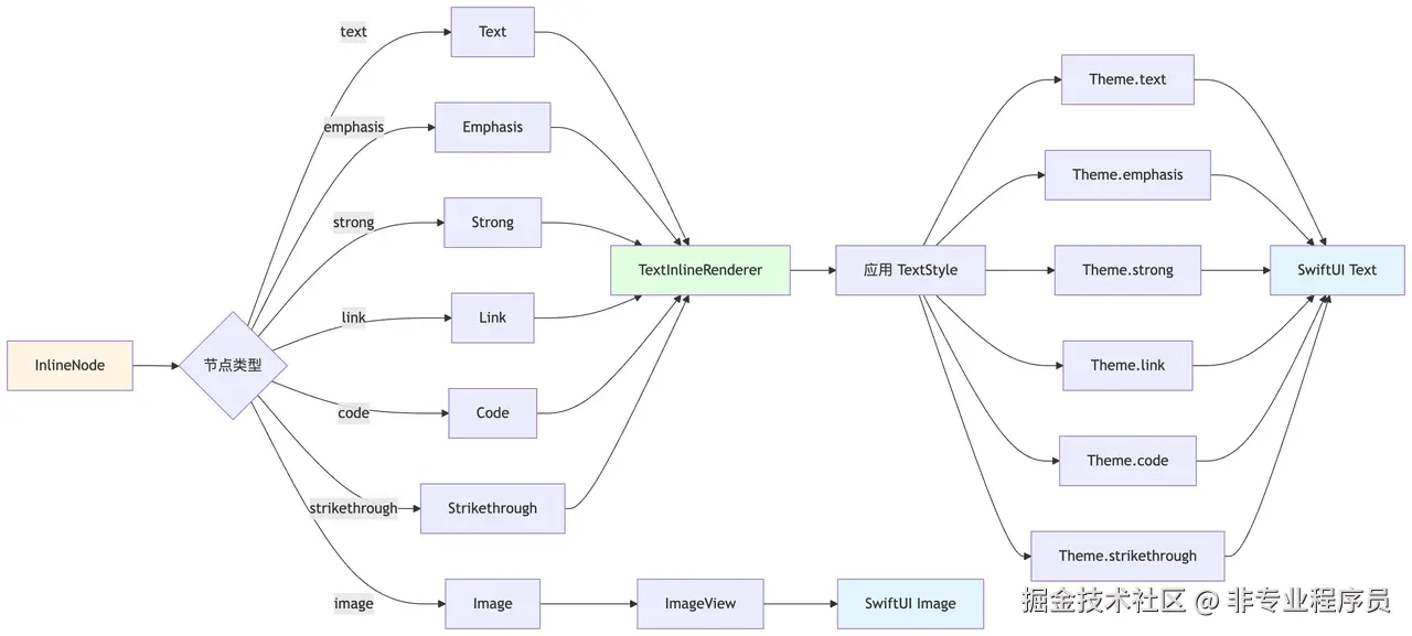 在 swift-markdown-ui 项目中,会将 Markdown 的语法树节点映射成 BlockNode 和 InlineNode,有前端经验的小伙伴应该比较容易理解,BlockNode 对应块级元素,如段落(paragraph),列表(list、item)等,InlineNode 对应行内元素,如文本、图片、链接等