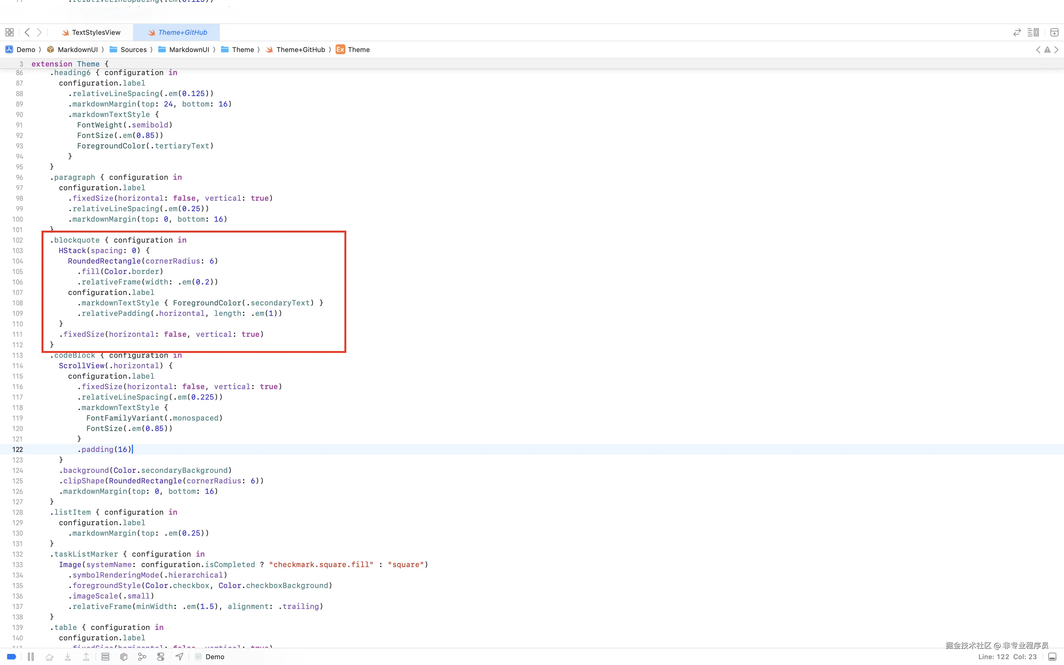 上面我们有提到每个 Block 节点都是一个单独的自定义 View,引用也是一个自定义 View,如下使用 HStack 将左边框和内容并排,高度靠内容撑开,关键配置是.fixedSize(horizontal: false, vertical: true),其中horizontal: false表示水平方向允许扩展,受父视图宽度约束影响,vertical: true表示垂直方向固定,完全靠内容撑开。