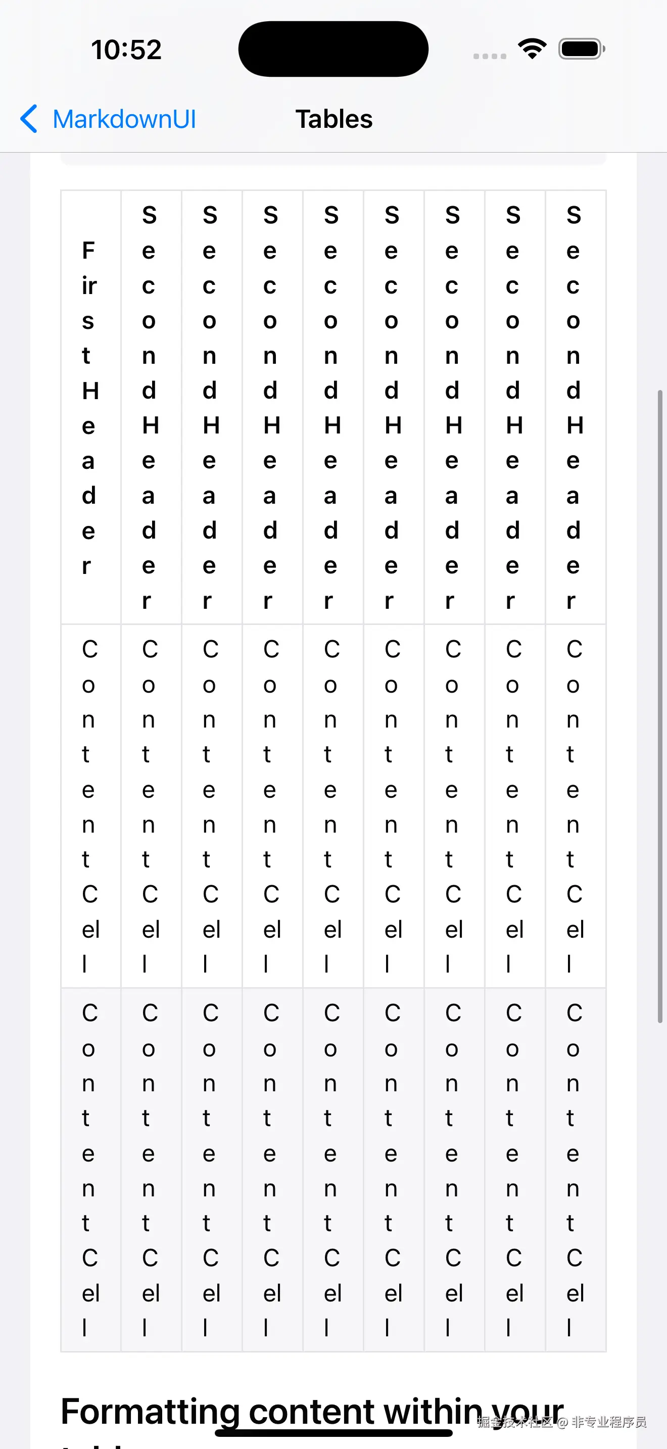 渲染时使用 SwiftUI 中的 Grid 布局 实现:Grid 布局天然支持了同行等高、同列等宽、跨行跨列(合并单元格)等特性,不需要复杂配置就能实现表格的效果。