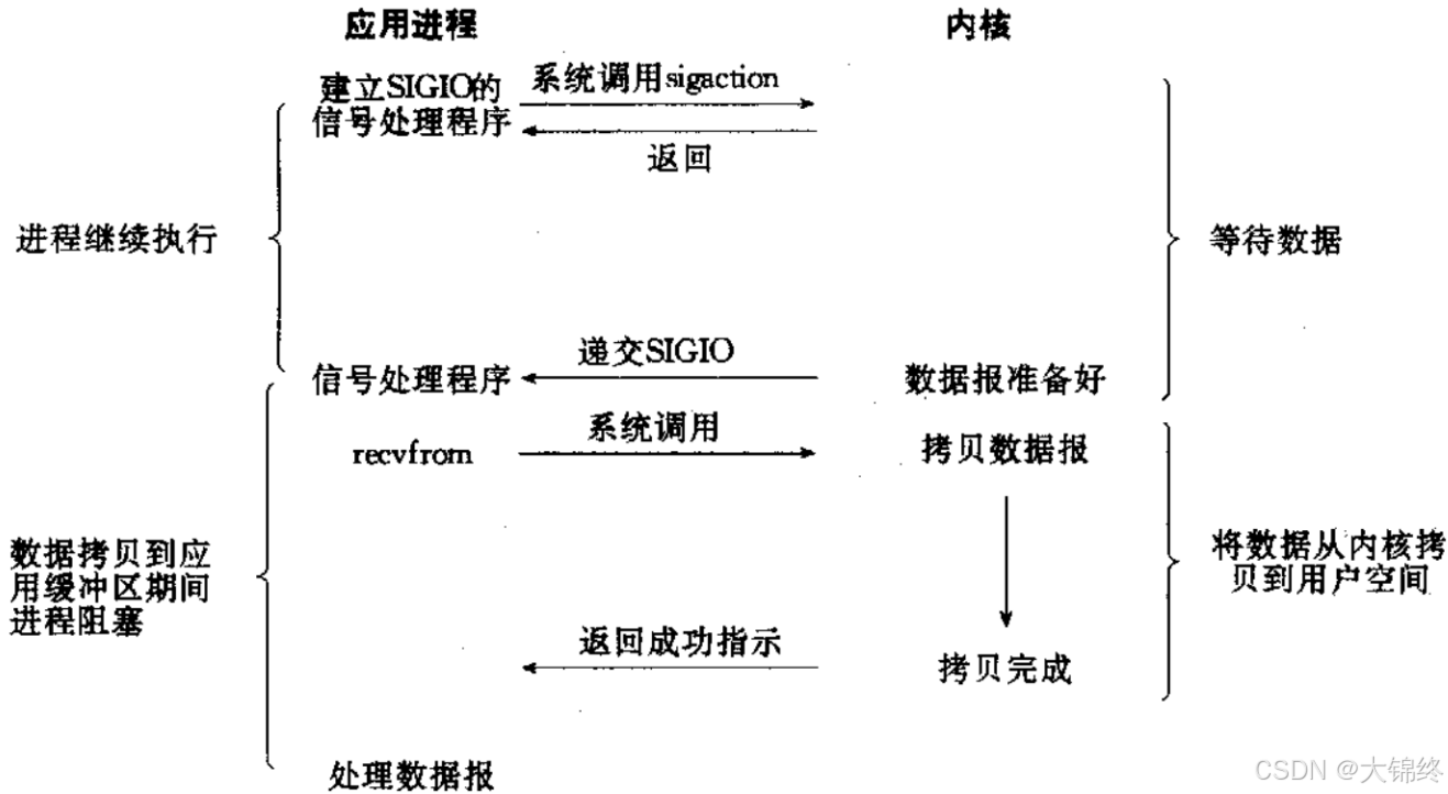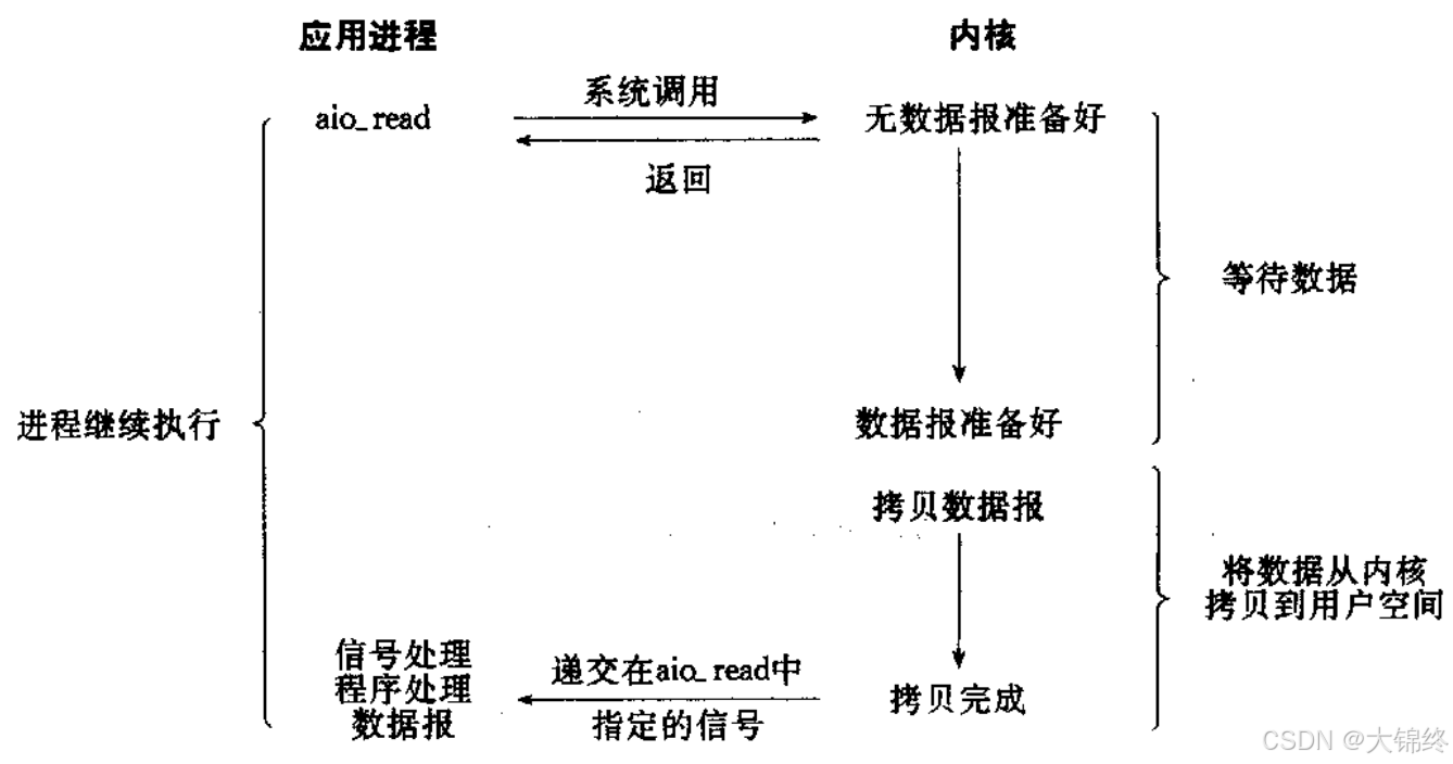 - 由内核在数据拷贝完成时, 通知应用程序(而信号驱动是告诉应用程序何时可以开始拷贝数据)