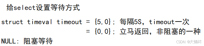 - 参数timeout为结构timeval,用来设置select()的等待时间。关于取值: